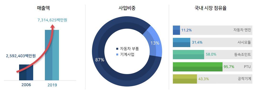 자동차 부품의 기초 소재부터 엔진과 모듈 등속조인트 등의 부품을 직접 생산하는 동시에 친환경 차량용 열관리 시스템과 수소전기차의 주요 부품인 공기압축기 등을 개발하며 미래 자동차 시장 트렌드에도 적극 대응하고 있습니다.
